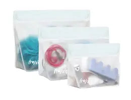 These (re)zip storage bags are sturdy enough to stand up on their own so they’re easy to fill. The double-seal shuts tightly enough to stop leaks. Like all genuine (re)zips, these are made of 100% food-safe PEVA, which is waterproof, lightweight, and durable enough to meet hundreds of lunch challenges, from portability to prettiness. Leftovers fans, we’ve packed (re)zips with stewed greens, sesame noodles, fruit salad, and a grain “bowl” into our work bags, saving all kinds of disposable bags along the way. And they’re just as good at keeping baby gear, pet supplies, gym stuff, and travel. Kit includes: (1) quart | 4-cup, (1) 2-cup and (1) snack | 1-cup bag - BPA-free, lead-free & phthalate-free - Hold their shape and stand up, so they’re easy to fill - Save hundreds of single-use bags - Airtight, waterproof, and leakproof - Freezer safe