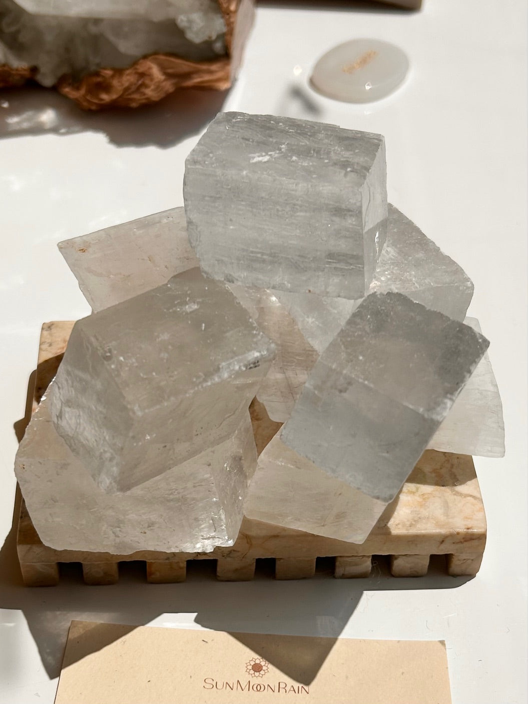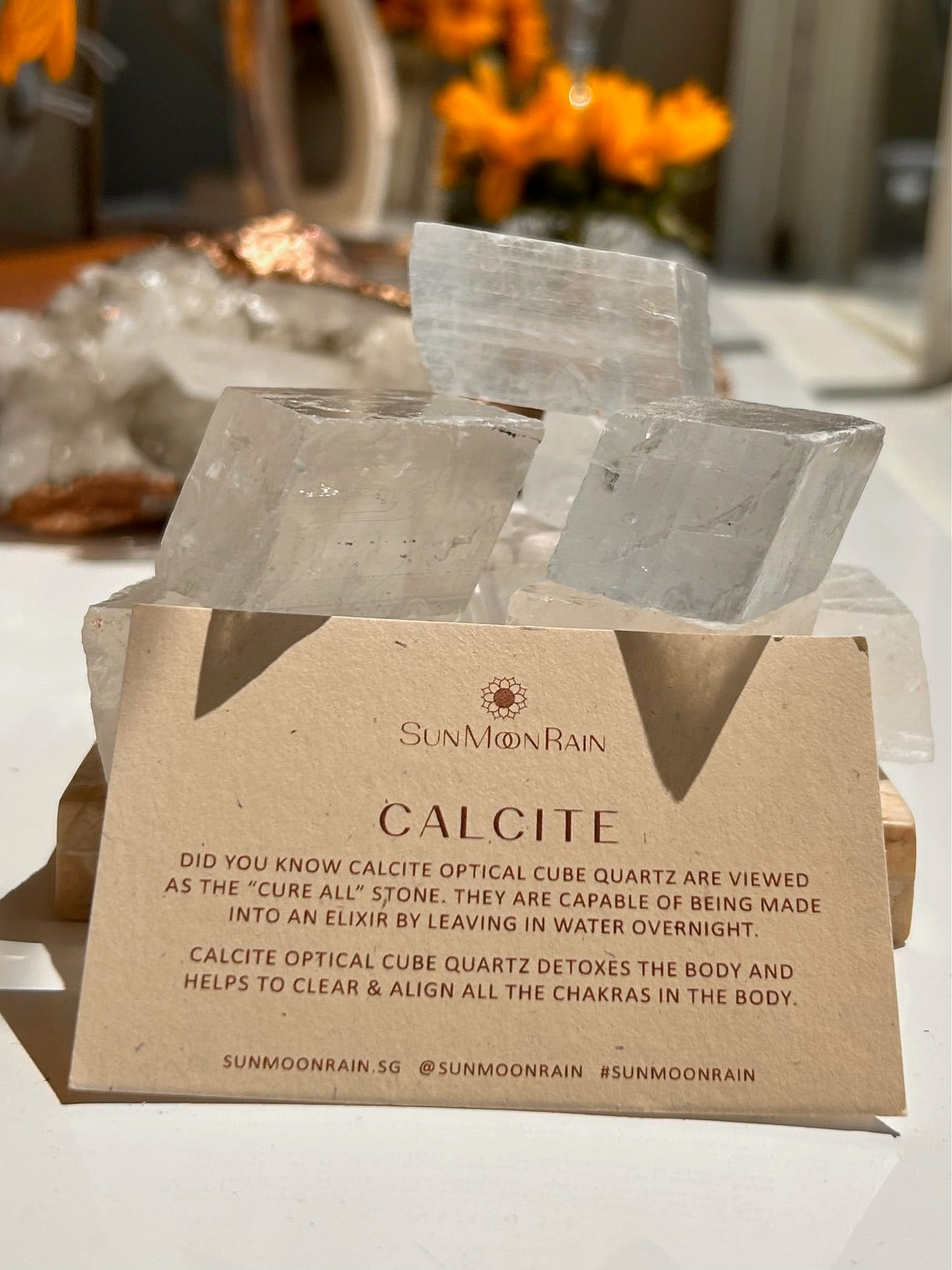 Calcite optical cube quartz are viewed as the "cure all" stone. They are capable of being made into an Elixir by leaving in water overnight. The Calcite cube detoxes the body and helps to clear & align the chakras in the body.
