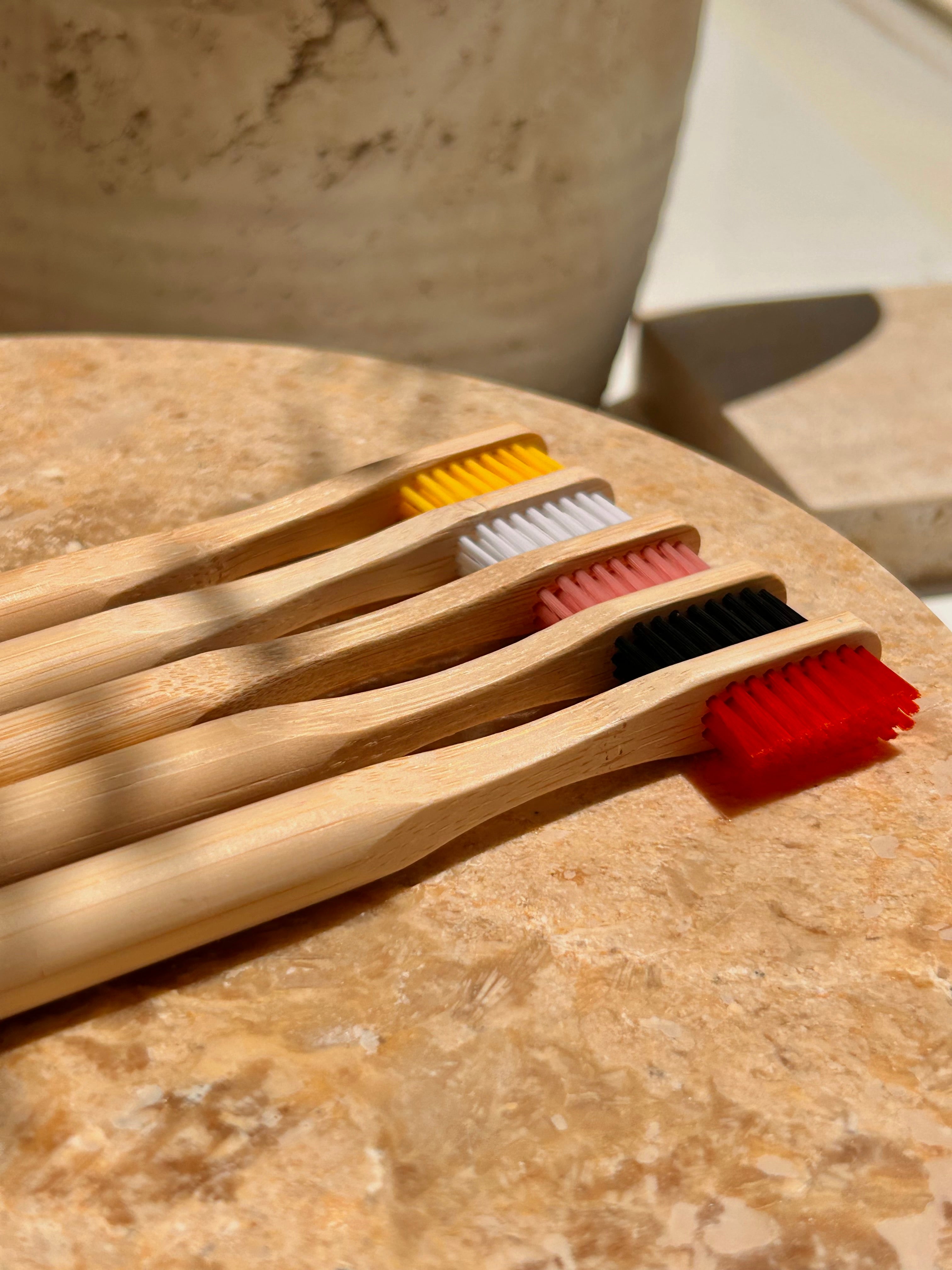 Our color dipped bamboo toothbrushes make it easy to know who is whose in the bathroom! All toothbrushes come with engraved saying on color tip - not all slogan/color combos shown in image. Scroll through what's available via the drop down!
