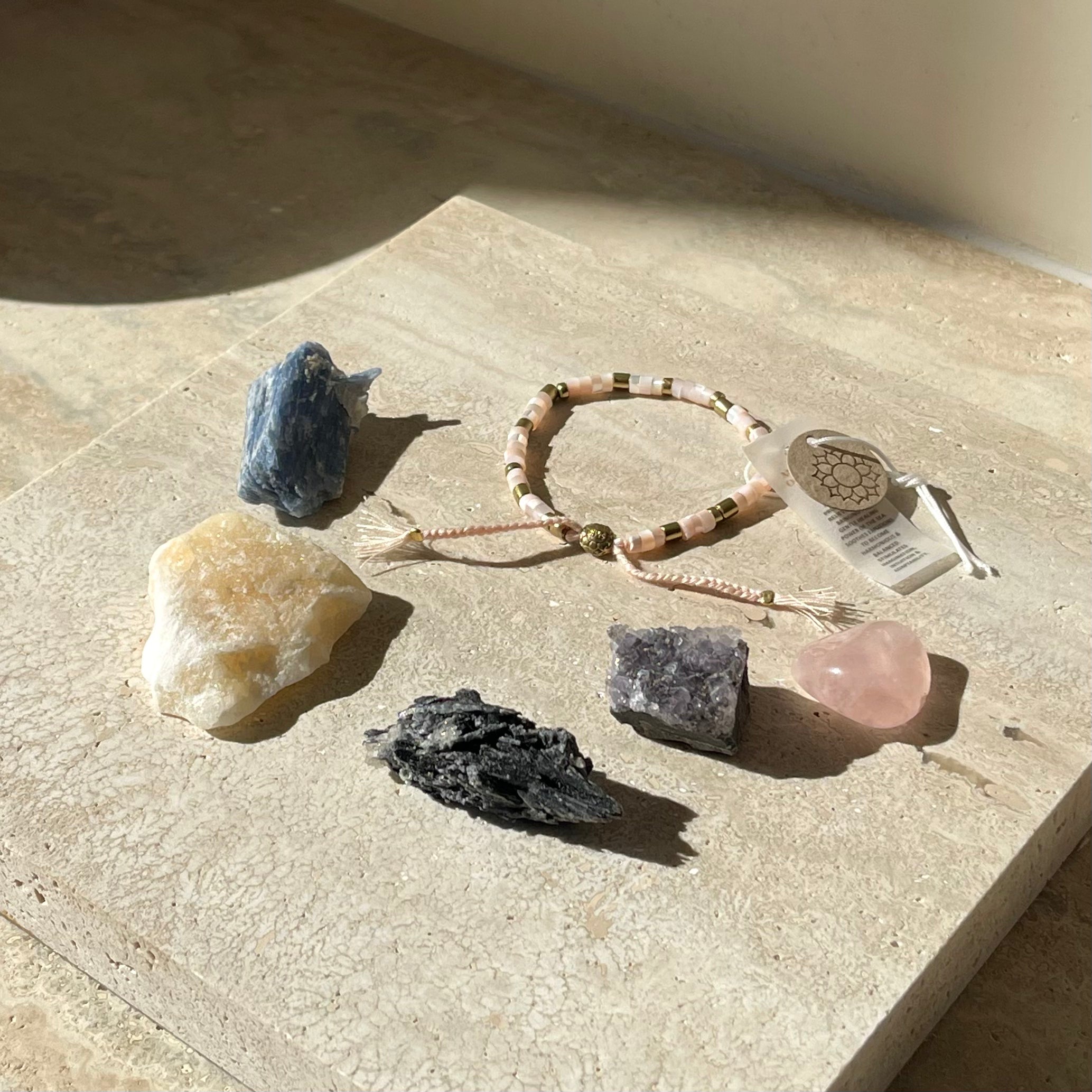 Gift the world of crystal energy with our Crystal Discovery Starter Kit, thoughtfully curated with a diverse selection of crystals including amethyst, calcite, and rose quartz. This kit allows you to explore the unique properties of each crystal and also includes a uniquely up-cycled rose quartz Earth Collection bracelet, enhancing your personal energy and style as you embark on your crystal journey.