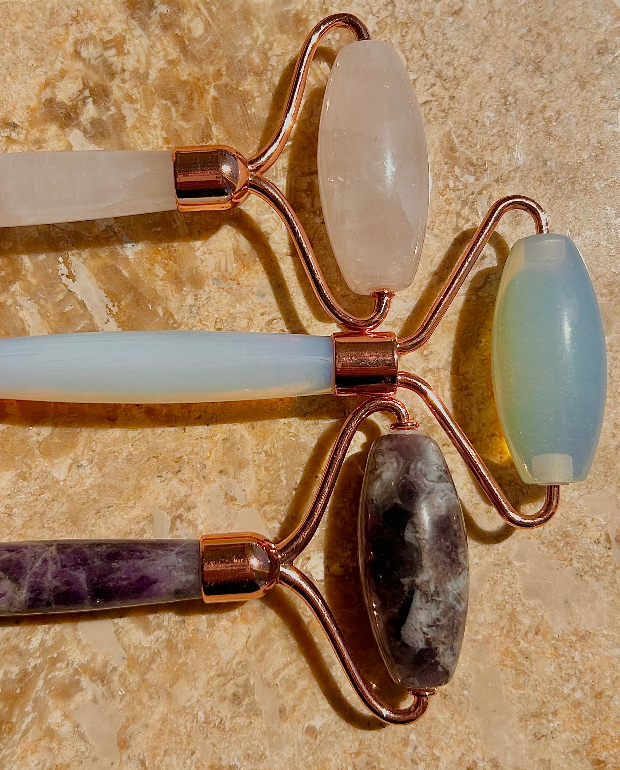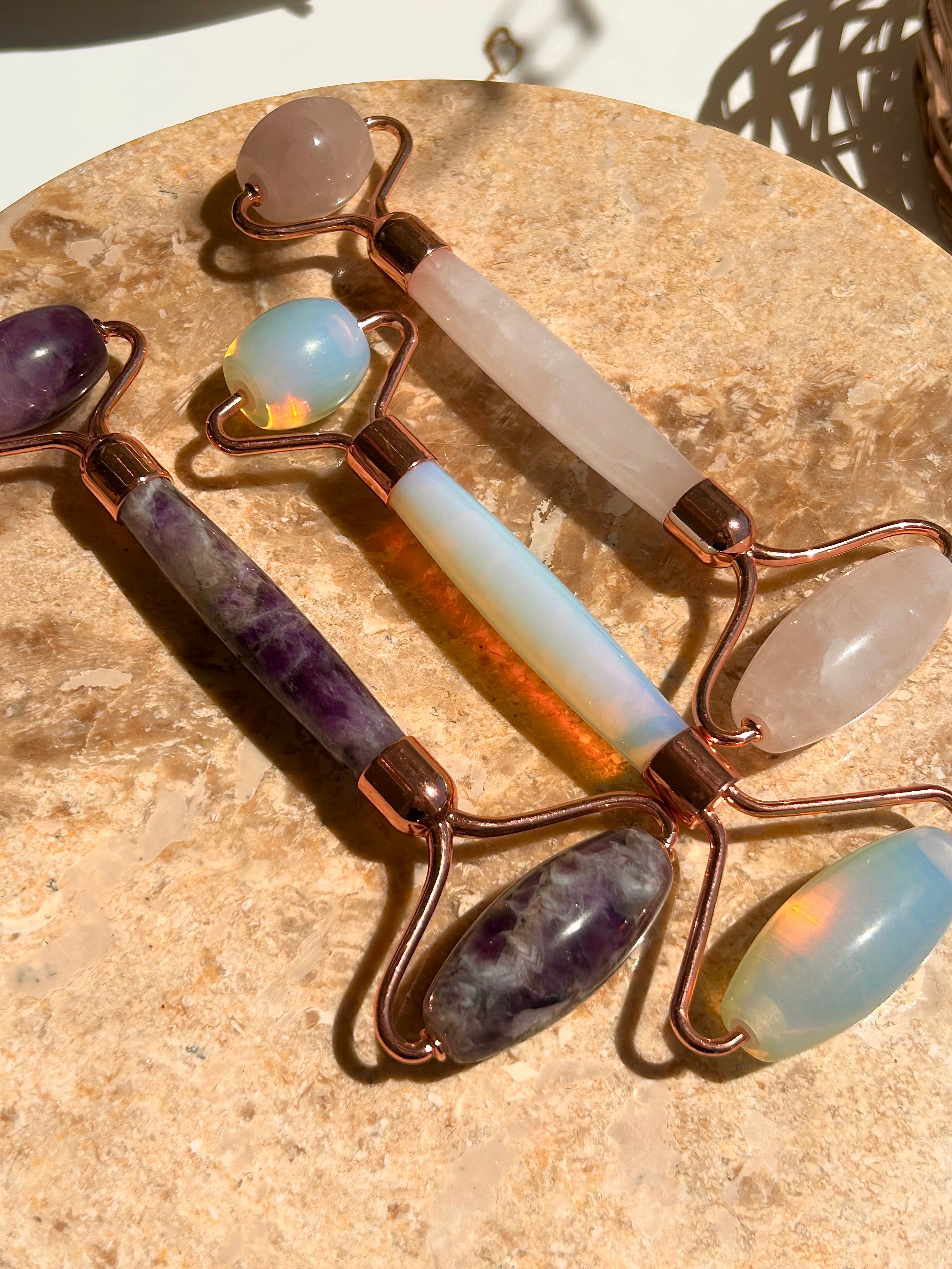 The Chinese have been using these beautiful crystal rollers to massage skin since the 17th Century. They are known to remove toxins from the skin, smooth fine lines, decrease under eye bags and dark circles, calm inflamation, heal breaks out, brighten skin. They have also been known to help reuce swelling by assisting the lympatic drainage in the face. We simply love them becuase they create an overall zen feeling and who can't appreciate that? Apply a few drops of one of our facial lotions, serums or facial oils to a dry, clean face. Roll up, down and sideways until all the product is absorbed. Feel Amazing!
