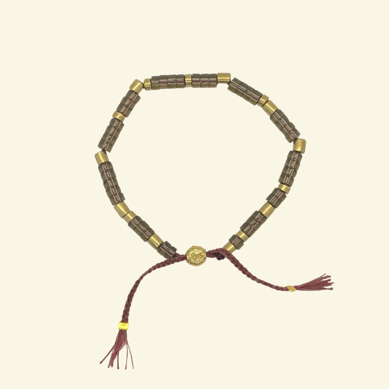 Each piece is crafted with positive energy disc-shaped crystals, vintage glass, seed beads, & up-cycled metal from discarded brass pots & pans.