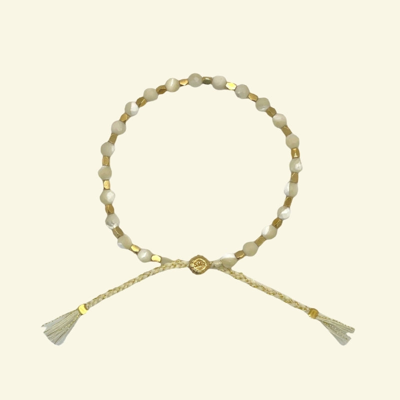 Bring positive energy to your life with this SunMoonRain 100% handmade healing & positive energy bracelet in Mother of Pearl with 18k rose gold vermeil nuggets that combines modern sophistication & design with healing abilities.