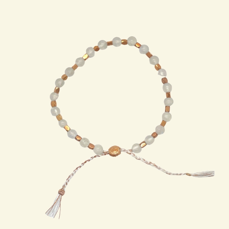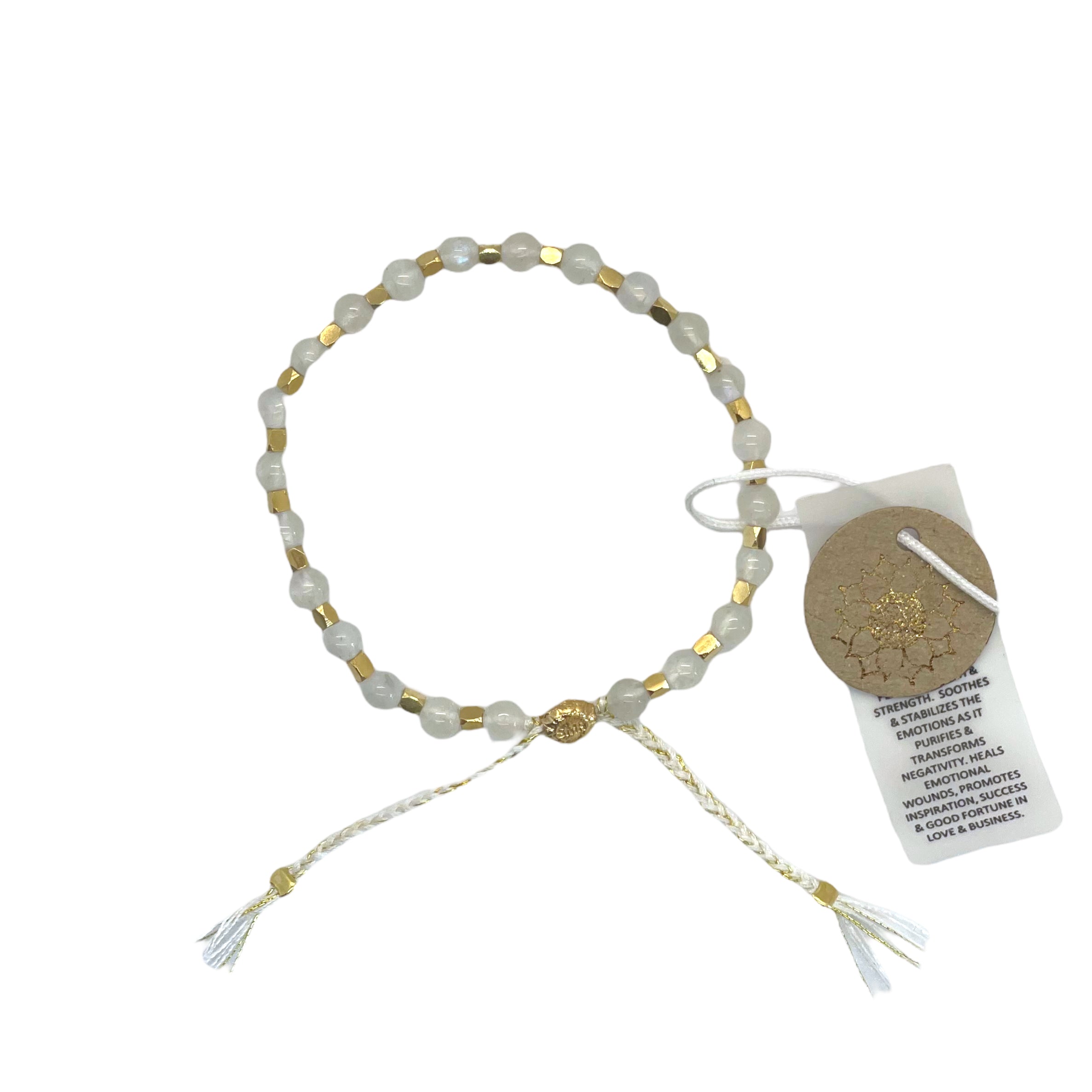 Bring positive energy to your life with this SunMoonRain 100% handmade healing & positive energy bracelet in Rainbow Moonstone with 18k yellow gold vermeil nuggets that combines modern sophistication & design with healing abilities.
