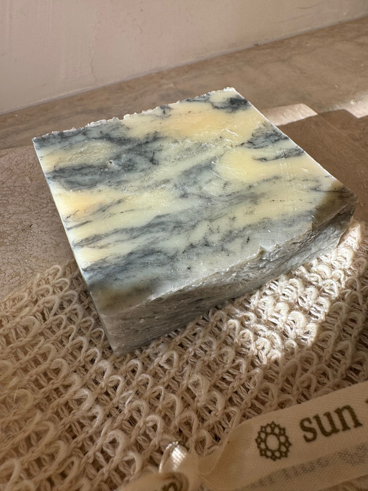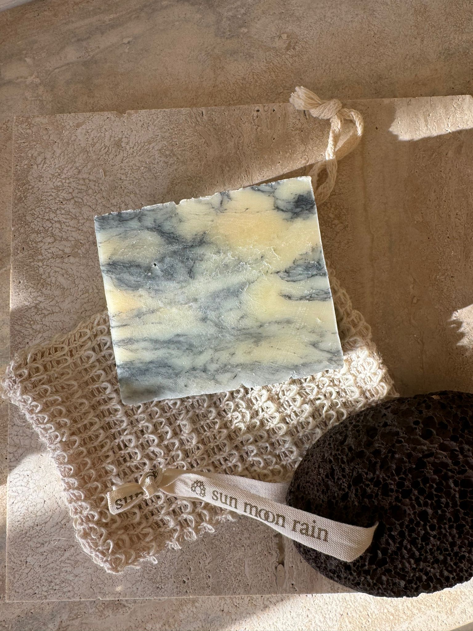 sun m⚭n rain lemon, clove & cinnamon soap bar + soap saver bag + pumice stone