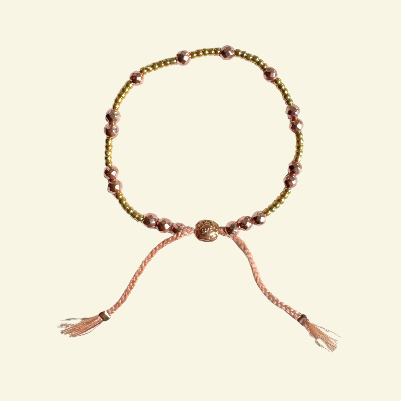 This Tribal Gypsy bracelet features faceted 4 mm rose gold hematite stones with iridescent & metallic beads on organic threads allowing for flexible sizing & durability. A sunflower bead in yellow or white bronze finishes the look stylishly.