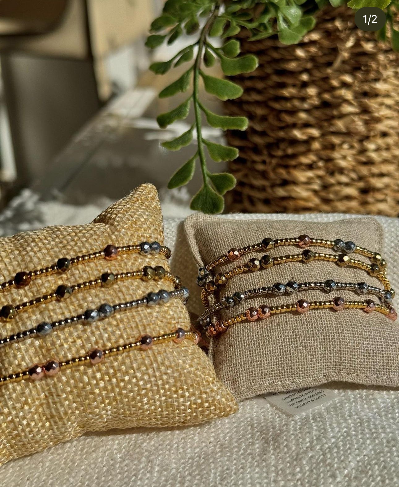 Each bracelet is tagged with an explanation of hematite's powers as well as a recycled paper envelope, to keep it safe. Circumference of bracelet is 17 cm - 19 cm.