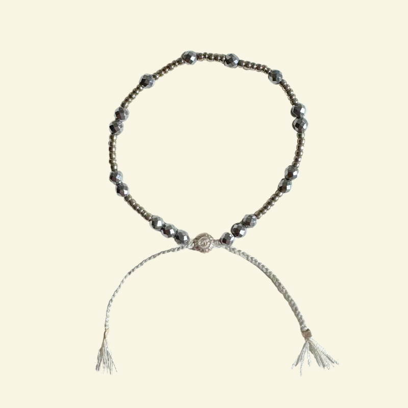 This Tribal Gypsy bracelet features faceted 4 mm yellow silver hematite stones with iridescent & metallic beads on organic threads allowing for flexible sizing & durability. A sunflower bead in yellow or white bronze finishes the look stylishly.